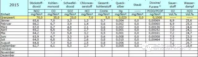 雖然歐洲2000的排放標準是我們國內所熟知和引用了,但是歐洲各國或地區所采用的標準則會比歐盟2000更為嚴格,以下圖為例,是Arnoldstein焚燒廠的最新排放公布數據,其中黃色行則是Arnoldstein當地所允許的排放標準,我引用在此供大家參考,這一現象與我國各地簽訂BOT項目需要高于國家標準的情況類似。
