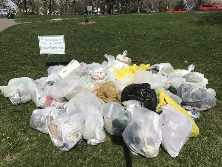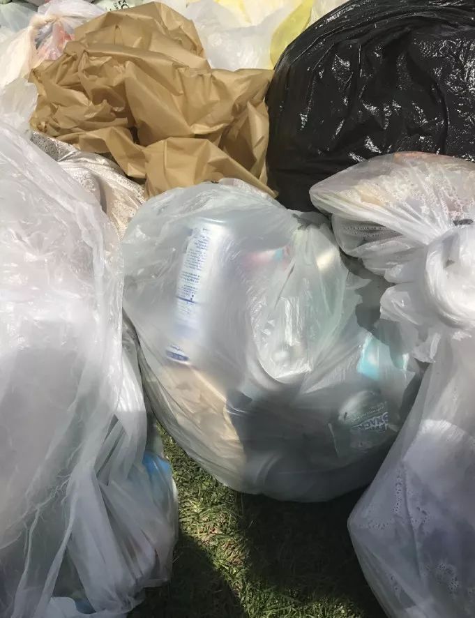 由于距離不遠,我們很快來到了公園門口,我們仔細地觀察了當地垃圾箱的分類情況,湊巧當日為地球日,我們一行在公園門口遇到了志愿者收集的垃圾,并且分成了2堆擺放。基于嚴謹務實的工作作風和對國內崇洋媚外宣傳的不屑,我們持著懷疑地態度詳細驗證了一下老美的分類是否真的做的那么完善,我們對2堆垃圾袋進行了拍照取樣。