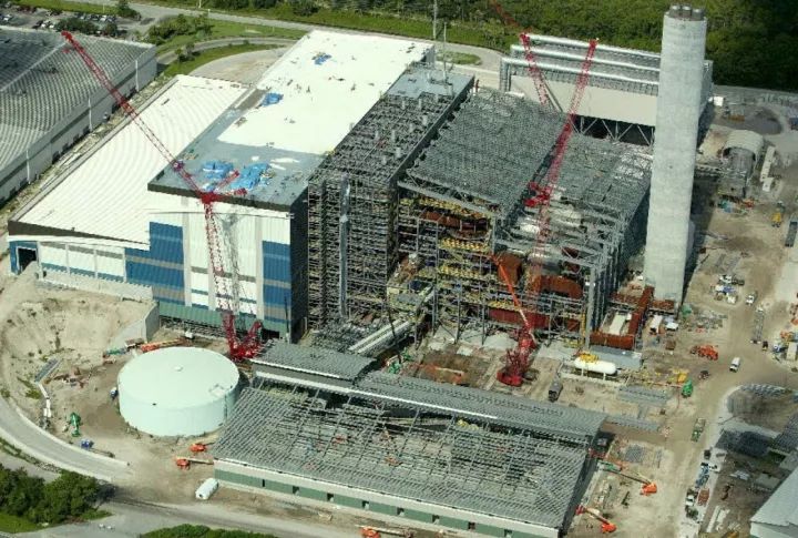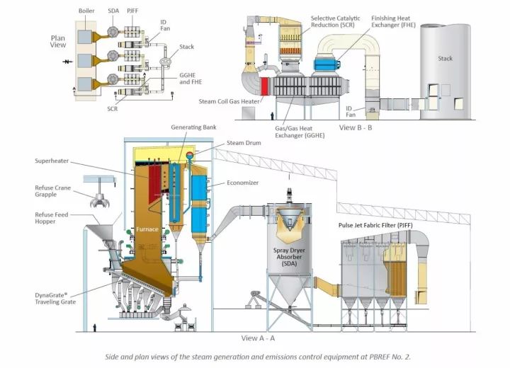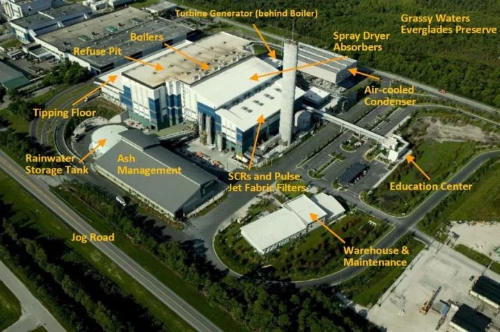 接下來說重點,介紹一下這個焚燒廠。全廠為3x1000t/d的偉倫爐排,煙氣工藝采用了SDA+布袋+GGH+SGH+SCR。該廠位于特朗普老家,而且離得不遠,是目前美國最先進的焚燒廠,也是第一座采用SCR工藝的焚燒廠,2012年開始建設至2015年投入商業運行,隸屬于佛羅里達州海岸縣固廢管理局。