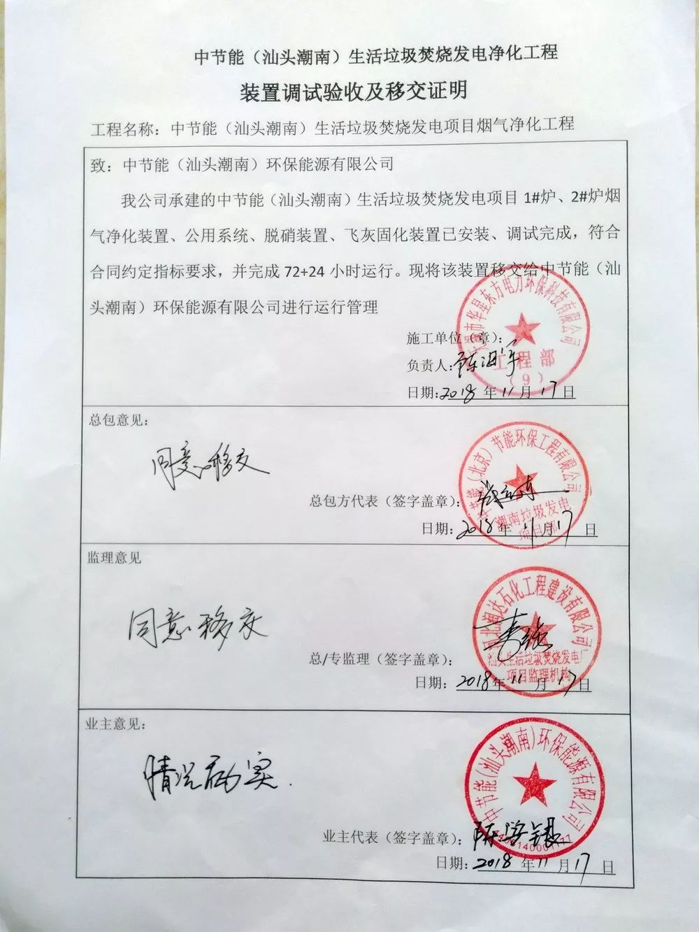 我公司承建的汕頭潮南2x500t/d生活垃圾焚燒煙氣凈化工程于2018年11月17日完成各項調(diào)試工作并通過驗收。