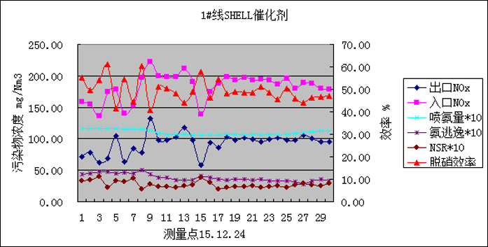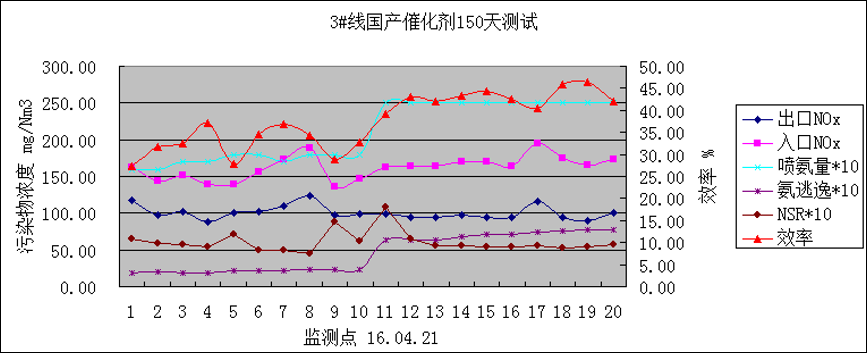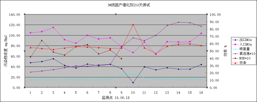 其次,對催化劑的效率進行了安裝初期(詳見圖14)、投運30天(詳見圖15)、150天(詳見圖16)、210天(詳見圖17)的4次取樣測試,以下為4次測試的相關數據(運行溫度170-175度)。