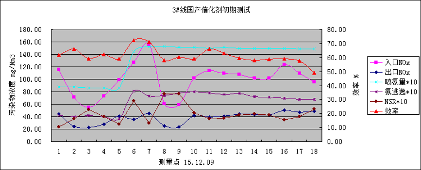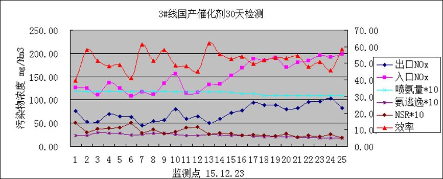 在進行上述檢測前,我們對2號線的催化劑性能分別于2015年9月18日/19日及10月15日/16日還進行了2次效率檢測,此時2號線的累計有效使用時間約為5個多月,在控制相同邊界條件如:噴氨量,氨逃逸量,鍋爐負荷,煙氣流量等數據的情況下,其2次檢測效率約在30-40%之間。
