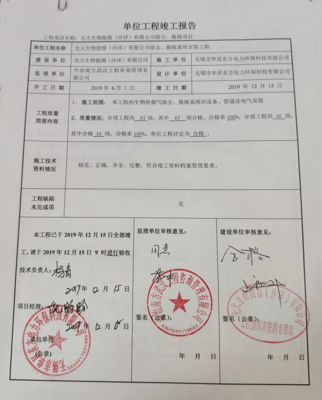 華星東方承建的光大沙洋生物質發電項目煙氣凈化工程通過竣工驗收