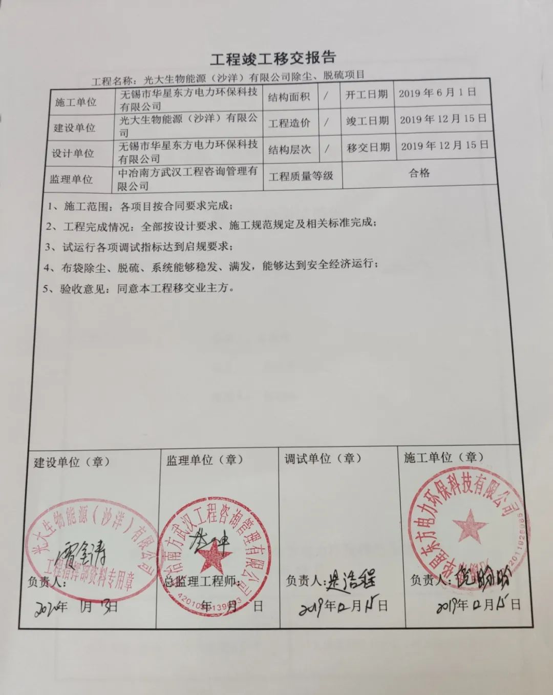 我公司承建的光大沙洋生物質發電項目煙氣凈化工程于2019年12月15日通過竣工驗收。