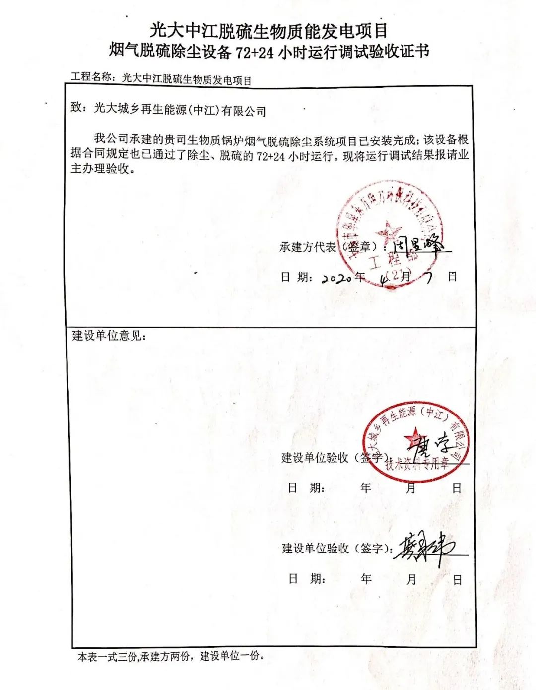 華星東方承建的光大中江生物質發電項目煙氣凈化工程通過72+24小時驗收