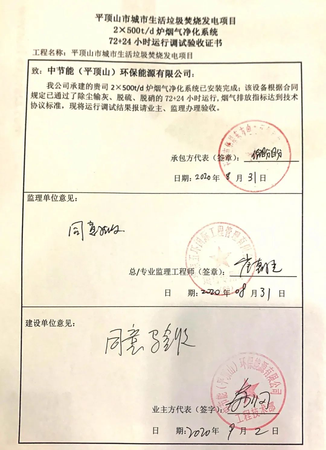 我公司承建的河南省平頂山生活垃圾焚燒發電項目煙氣凈化工程于2020年9月2日通過72+24小時試運行。