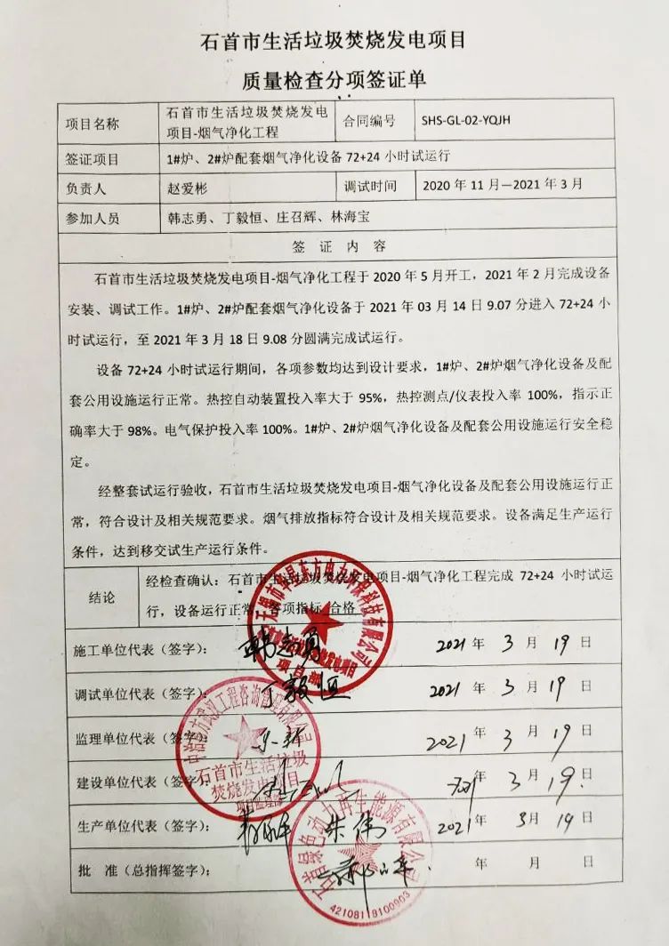 我公司承建的湖北省石首市生活垃圾焚燒發(fā)電項(xiàng)目煙氣凈化工程于2021年3月18日通過(guò)72+24小時(shí)試運(yùn)行。