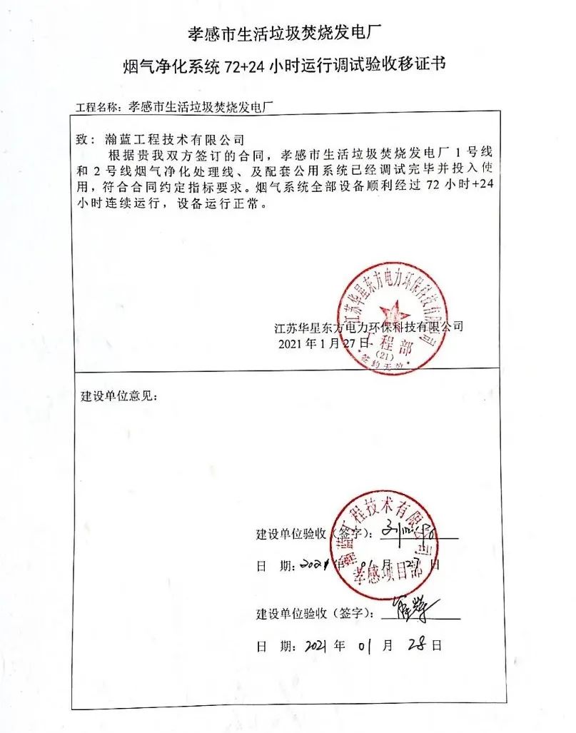 我公司承建的湖北省孝感市生活垃圾焚燒發電項目煙氣凈化工程于2021年1月28日通過72+24小時試運行。