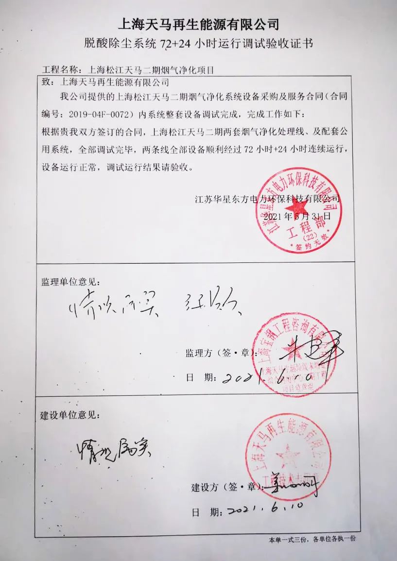 我公司承建的上海松江天馬二期煙氣凈化工程于2021年6月10日通過72+24小時試運行。