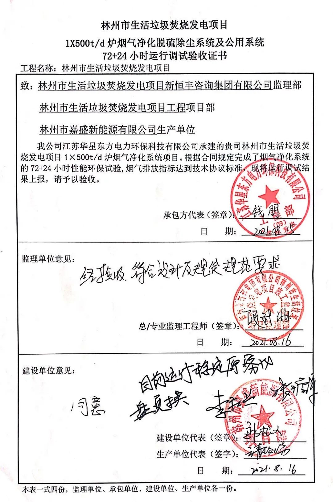 我公司承建的河南省林州市垃圾焚燒發電項目煙氣凈化工程于2021年8月16日通過72+24小時試運行。