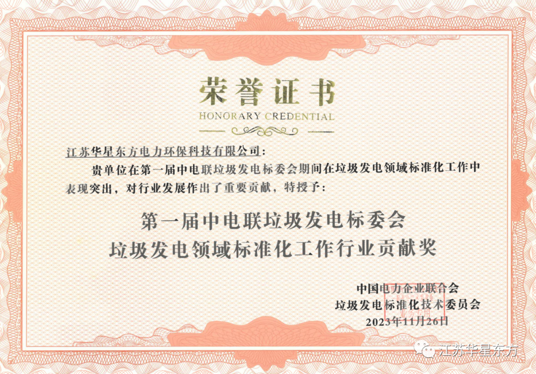 2023年11月28至30日,第二屆中電聯垃圾發電標準化技術委員會成立大會暨2023年度工作會議和標準審查會,在北京成功舉辦,江蘇華星東方榮獲“垃圾發電領域標準化工作行業貢獻獎”。中電聯標準化管理中心副主任汪毅、發電處處長汪萍到會指導。第二屆標委會成員共35人,中國電力發展促進會可再生能源發電分會副會長劉映華榮任主任委員,中國電力發展促進會可再生能源發電分會副秘書長劉哲擔任秘書長。