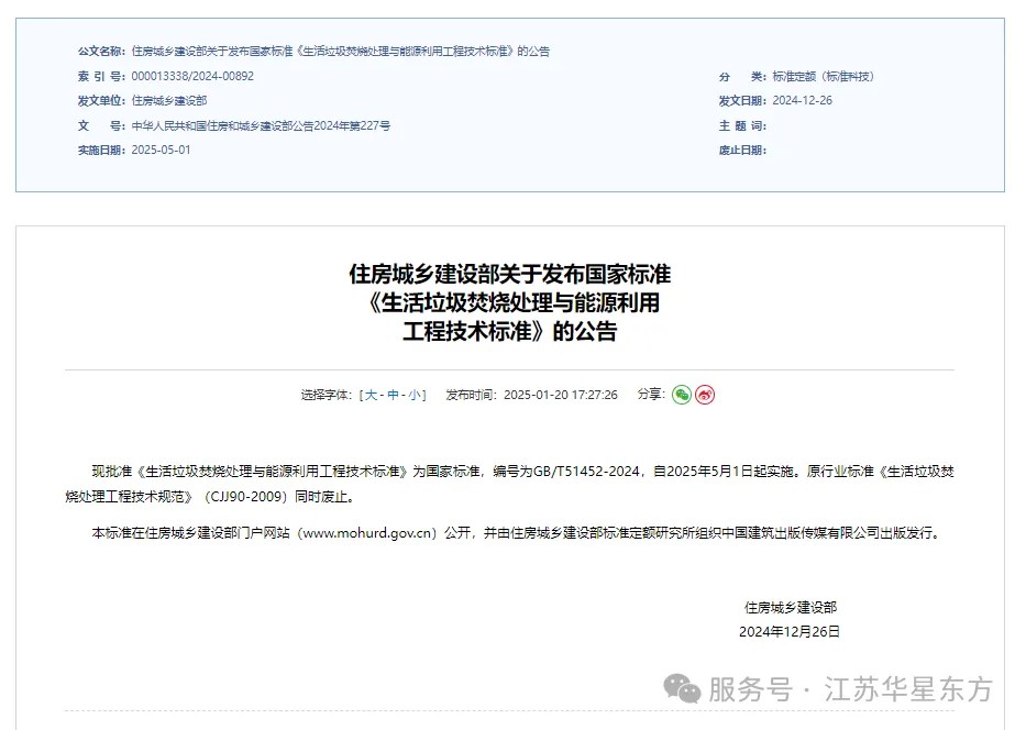 喜報?華星東方參編的國家標準《生活垃圾焚燒處理與能源利用工程技術標準》(GB/T51452-2024)正式獲批