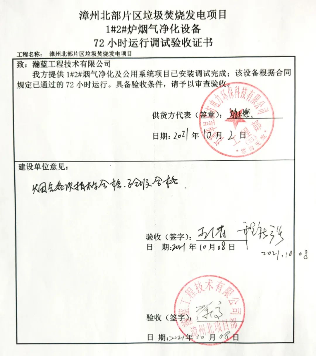 我公司承建的福建省漳州北部片區垃圾焚燒發電項目煙氣凈化工程于2021年10月8日通過72+24小時試運行。