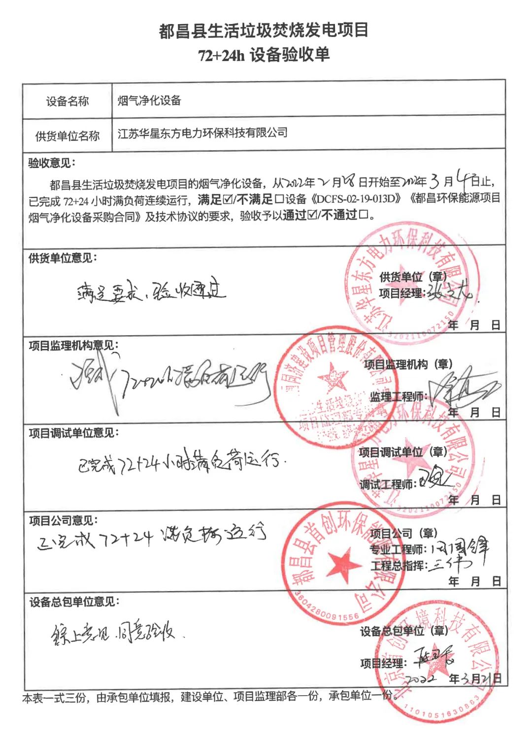 我公司承建的江西省九江市都昌縣生活垃圾焚燒發(fā)電項(xiàng)目煙氣凈化工程于2022年3月21日通過(guò)72+24小時(shí)試運(yùn)行。
