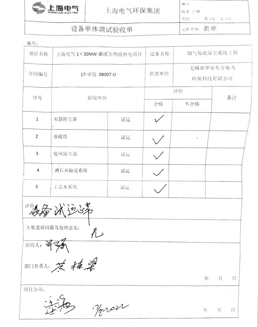 The FGC project undertaken by Huaxing for Suixi Biomass Power Plant in Huaibei, Anhui passed the commissioning acceptance