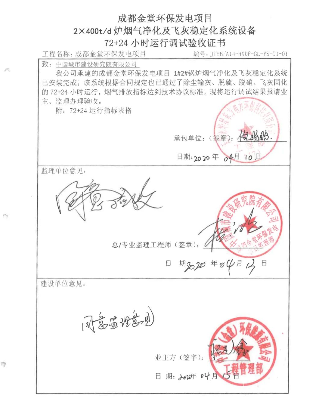 我公司承建的四川省成都市金堂縣生活垃圾焚燒2x400t/d發(fā)電項(xiàng)目煙氣凈化工程于2020年04月15日通過72+24小時(shí)運(yùn)行驗(yàn)收。