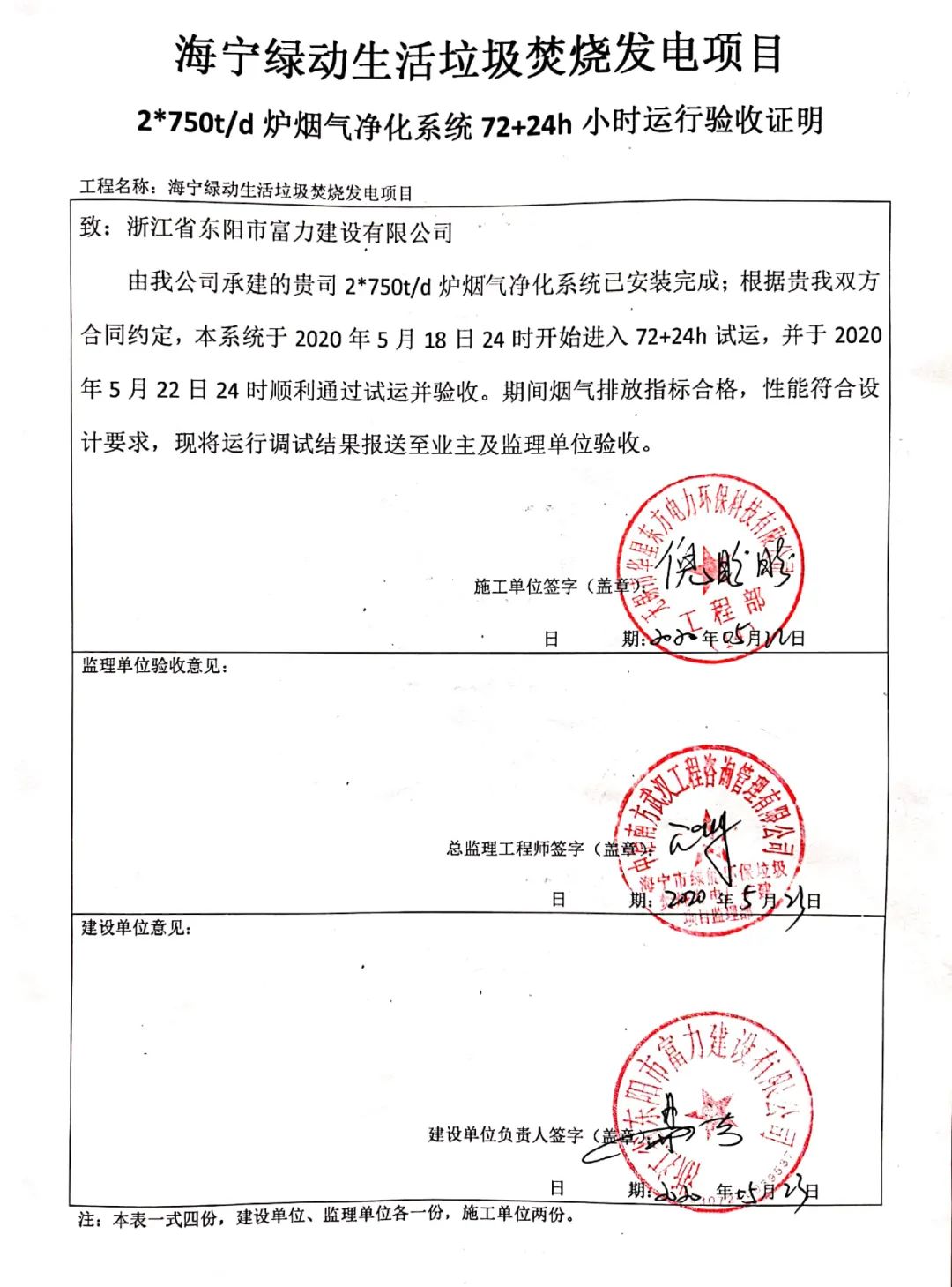 我公司承建的浙江省海寧市生活垃圾焚燒發電項目煙氣凈化工程于2020年5月18日通過72+24小時試運行。