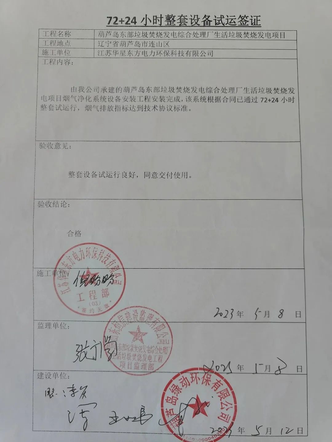 我公司承建的遼寧省葫蘆島市生活垃圾焚燒發(fā)電項(xiàng)目煙氣凈化工程于2023年05月08日通過72+24小時(shí)試運(yùn)行。 The flue gas cleaning (FGC) project undertaken by Huaxing-east for the waste incineration power plant in Huludao, Liaoning has passed 72+24 hours of trial operation on May 8, 2023.