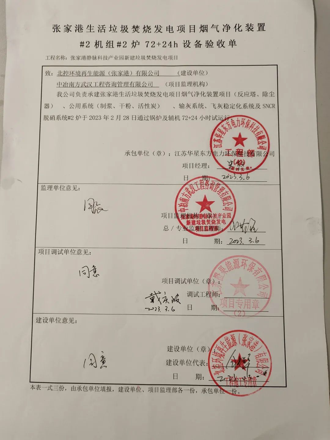 我公司承建的江蘇省張家港市靜脈產業園生活垃圾焚燒發電項目煙氣凈化工程于2023年02月28日通過72+24小時試運行。